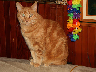 Our orange tabby Marley died this morning. While it was not a sudden passing, he declined pretty quickly. We first noticed he had lost considerable weight only a week ago, but for a week or two previously seemed lethargic without much appetite. We got him into the vet quickly last Tuesday, and they kept him for a few days for some X-rays, blood tests and IV fluids. We got him back Friday and saw he had continued his slide - he could hardly stand and we were syringe feeding him to try to get some food in him. Another quick trip to the vet on Saturday before they were unavailable for the weekend brought a slight change in meds, including some for pain. Mostly he sat near us through the day. Melinda had a bit of a cold and sore throat, so stayed home from work and stayed up with him Saturday night, waking me at 5am to tell me he had stopped breathing and had died quietly. The cause remains undiagnosed...