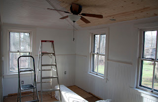 So after a few days of effort, the final color scheme is in place. Beside the pink drywall, the wainscoting is "soft white" (really a pale butter yellow), the trim between them and the window trim an "eggshell white", and the beadboard ceiling is a bright true white. Whew - lots of color coordinating, but everyone is happy! The room looks great already and the windows (which I stripped and reglazed in July) look spectacular - matching the view of the Fox River outside.