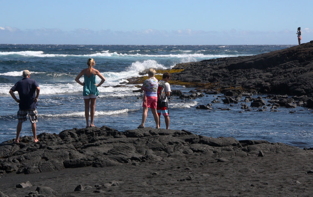 But we did stop at one of the most well-known black-sand beaches, Punalu'u Beach. Like the white sand beaches (at least in Hawaii) caused by breakdown of shells and coral, the black sand is the result of the erosion of the black lava from the island's volcanoes. The beach is shockingly dark, as I expected, I guess... Almost as surprising were the numerous green sea turtles basking on the beach there. In the short time we were there, at least 3 were basking on the beach, while several were seen struggling against the surf and rocks to come to shore. While endangered, we saw several at nearly every beach we spent time with during our visit. We hope this is a trend and they continue to recover.