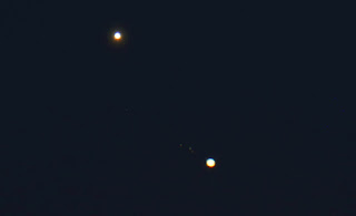 With Mercury out of the picture, it was showtime! I set up the 300mm lens with Melinda's T1i camera for a wide-field shot - it does a good job of recording the scene as it appeared by eye or a little optical aid like binoculars. Unfortunately at this scale it shows some hints of the moons of Jupiter, the lower right of the pair, but doesn't resolve them well. Still, a nice view of the jewels hanging over the Observatory. On the "big" scope (the TEC 140), I mounted the Canon 6D that had video capability. Since I had been recording the planets and mountain profile with the scope above, I didn't have time to change out the 2" adaptor to the field flattener and low-vignetting adaptor, so both here and in the video there is vignetting (darkening in the corners) from the 2" accessories blocking part of the image for the larger sensor. The image at right was taken just before starting the video, and clearly shows Jupiter's moons clearly resolved in the 30th of a second exposure (ISO 6400!). Similarly the video should have the same resolution, but is clearly degraded below.