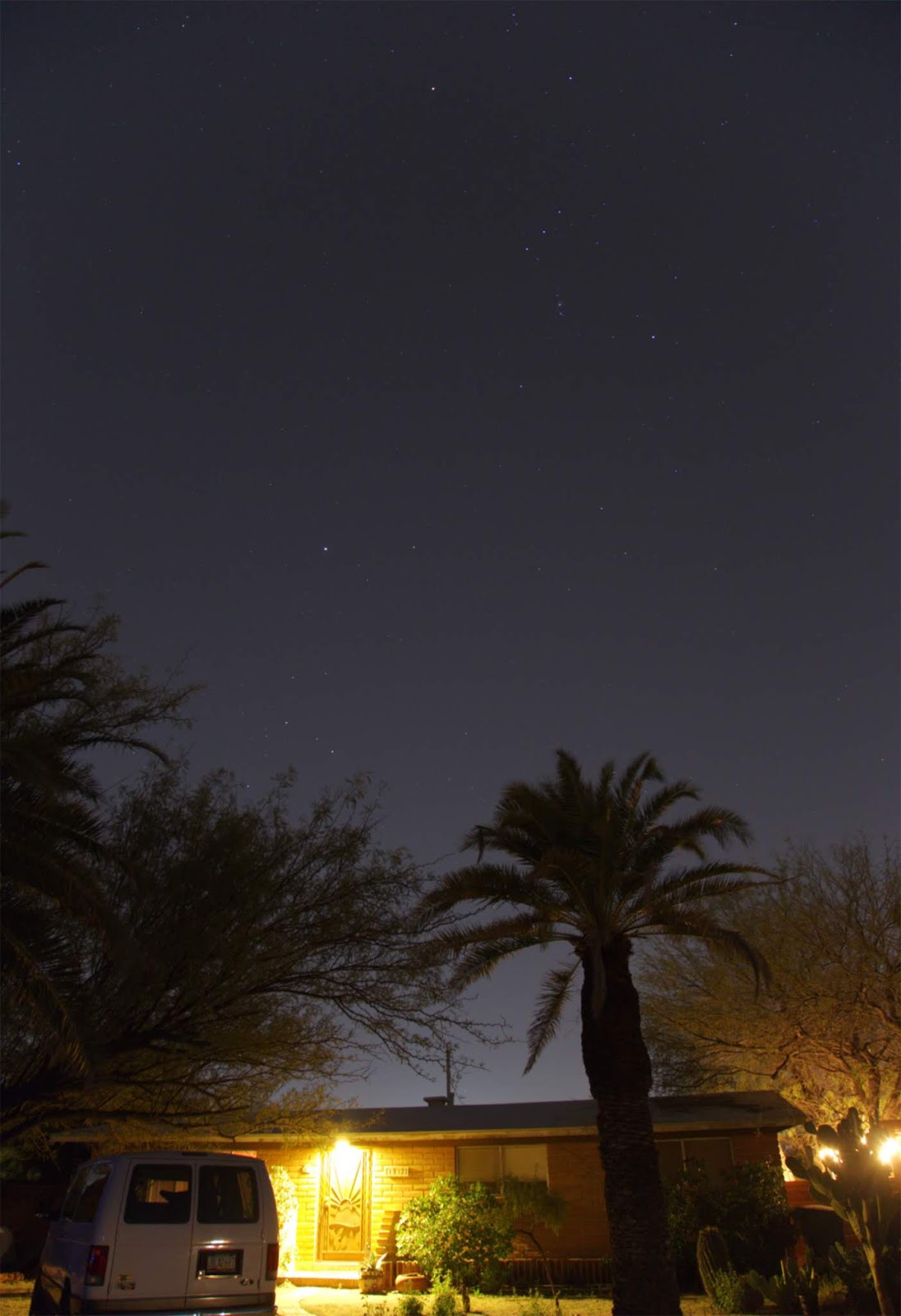 Next up was the surprise of the night! Even though it was hanging over the glow of Tucson, the galaxy Messier 81 and 82 are the perfect sort of targets for this lens. But thanks to the wide field of view of this lens, as the first image read out, I spotted the green glow of a comet - sporting a tail too! Someone had mentioned that "bright' comet C/2017 T2 PANSTARRS was going to be adjacent to this pair, but had promptly forgotten... This comet was discovered 2.5 years ago by the Panoramic Survey Telescope and Rapid Response System located at Haleakala Observatory in Hawaii. On this night it was about 150 million miles from both the sun and the earth. It has passed it's closest point to the Sun and Earth, and will now be slowly fading... This is only 8 minutes of stacked exposures, But even in those 8 minutes, the comet has trailed slightly. I chose to leave the galaxies sharp rather than center on the comet and trail the galaxies the small amount...
