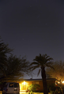 We didn't feel like going a long way, so decided to head out to Empire Ranch, where the Tucson astro club used to observe for many years. What we didn't plan on was that many others would be breaking their "shelter at home" stint - the old airstrip we used to use was filled with a good 10 or 12 RVs and plenty of ATVs rolling around as sunset approached. We headed to the far eastern end and found a relatively secluded spot and no one bothered us most of the night, though loud rock music wafted our way, only pissing-off one of our trio! First order of business, even before setting up gear, was to take a set of sky flats while it was still light. Regardless of how good the optics are, there are always some non-uniformities in illumination across the field of view. If you photograph a blank, uniform sky, you can help "flat field" the images to correct for vignetting - light falloff towards the corners of the frame. At right is shown the final stack of 12 shots of the overhead sky taken at 4 different rotation angles to average out any gradients in brightness... Contrast was adjusted to bring out variations, but generally the center of the field is a little brighter than the corners (by a fraction of a percent), and the shadow at the bottom is likely caused by the DSLR mirror shadow, flipped out of the way during the exposure...
