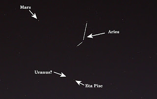 Next up was a test of scattered light and sensitivity to faint objects. Lower in the west, was Leo, and one of the easiest galaxies to find, even though it wasn't discovered until 1950! Find the brightest star in Leo - that would be Regulus, and point just north of it. The dwarf galaxy Leo 1 (UGC 5470) will be in your field... At 11th magnitude, it is likely one of the 200 brightest galaxies in the sky, but it was hidden behind the glare of Regulus until 70 years ago... Only 800,000 light years away (about one third the way to the Andromeda Galaxy), it is thought to be a satellite gravitationally bound to our Milky Way... It is the little smudgy glow above the bright star. BTW, North is up in all of these images!